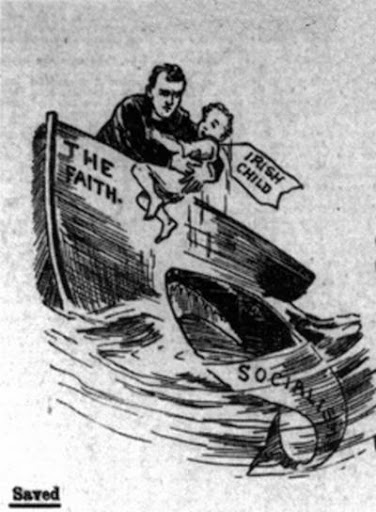 Children were most at risk. Sympathizers in the suffrage movement in England formed a scheme to take the children to homes there, where at least food and warmth and some comfort might be promised. This scheme provoked the ire of the Catholic Hierarchy, which feared for the moral well-being of Irish innocents in English homes. The Church Militant, in its usual guise in Ireland of the Ancient Order of Hibernians, arranged howling middle-class mobs at the docks and railway stations to thwart the children's departure. The women accompanying the children were arrested for kidnapping. These same voices had been silent hitherto on the children's hunger.