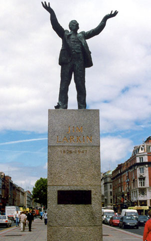 Jim Larkin — Irish socialist, trades unionist; known to his followers as "Big Jim" – the nickname earned as much by his large and outgoing personality as by his tallness of stature. He was born in Liverpool in 1876 of Irish parents, raised by his grandparents in Ireland until the age of 9, when he returned to England to start working. By the age of 18 he had risen to be a foreman at Liverpool docks – a position he sacrificed when he went on strike with the boys under him, rather than betray their interests.