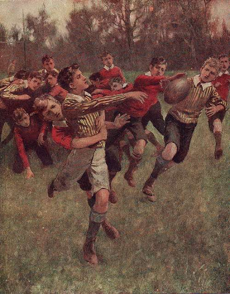 rugby — "Football, which, as a game, is worth ten of cricket, is played in short flannel knickers with perfectly plain ends, bare legs, heavy hob-nailed half-boots of chrome leather, and a jersey. It necessitates a complete change before and after play, especially after, as a serious player, particularly of the Rugby game, is liable to have little of him visible, for mud, when the whistle blows 'time.' A very complete bath, with soap, is therefore indicated. Football in the Winter, and cricket in the Summer, are the only games treated seriously at good-class schools." – The Boys' Outfitter, 1920.